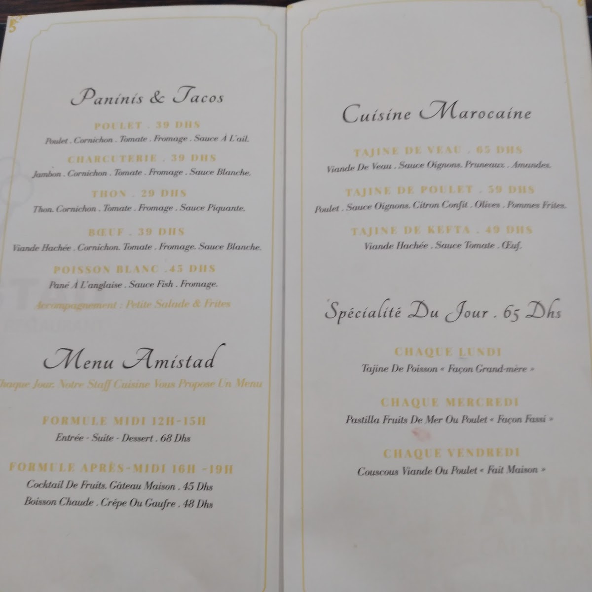 Introducing the menu at Amistad, located in the heart of Casablanca, is a delightful experience that promises to engage your senses. Renowned for its excellent Moroccan tea, Amistad offers a vibrant menu that caters to every palate. The café boasts a warm and inviting ambiance, ideal for a relaxing break from the bustling city outside.